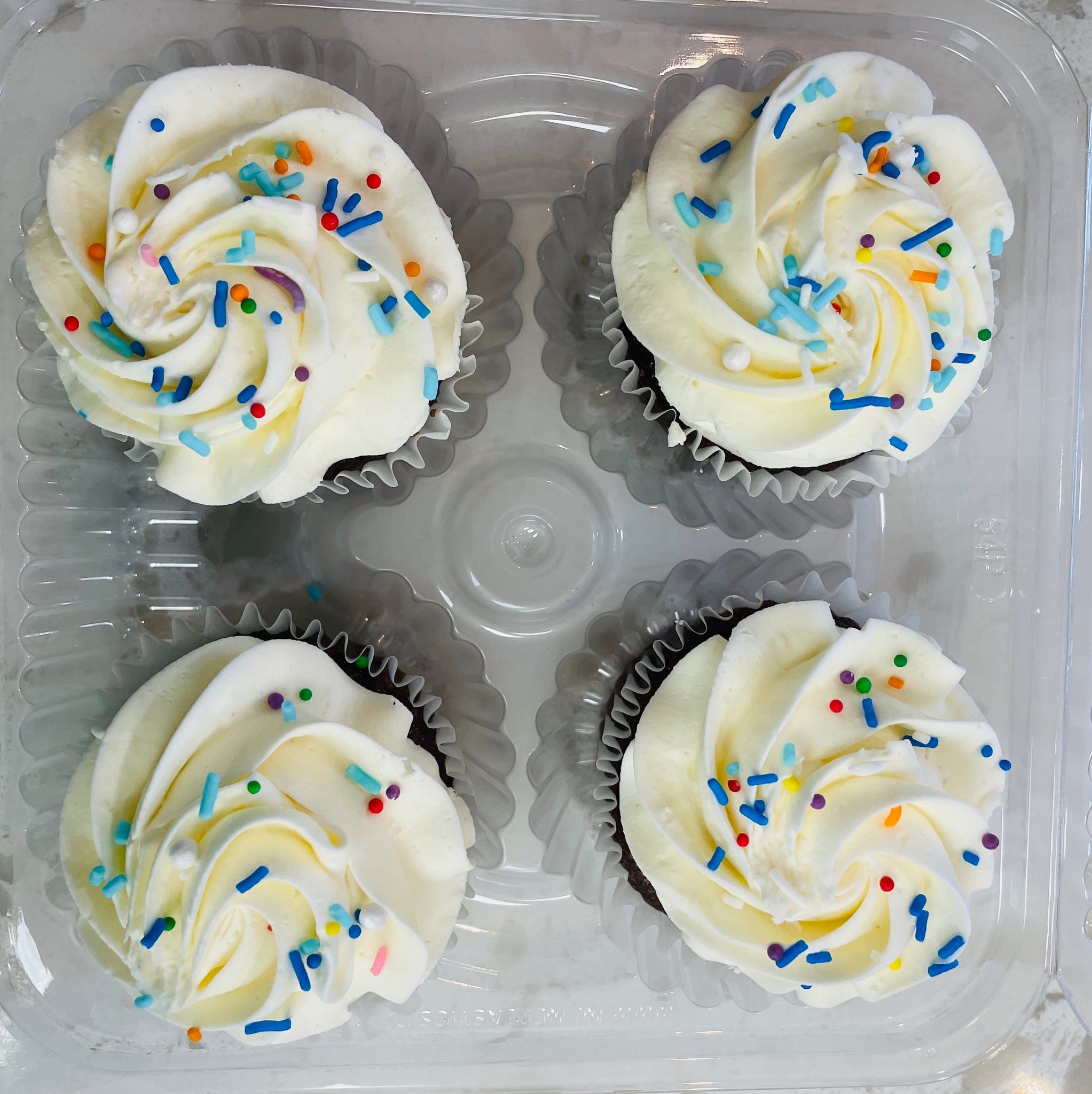 Vanilla Cupcake Ingredients: Cake {Sugar, Gluten free flour blend (white rice flour, brown rice flour, tapioca starch, xanthan gum), Sour cream (modified milk ingredients, modified cornstarch, sodium phosphate, carrageenan, locust bean gum, guar gum, microbial enzyme, bacterial culture), Butter, Egg, Milk, Vanilla extract, Baking powder, Salt, Baking soda]. Icing (Icing sugar, Butter, Cream, Vanilla extract, Salt) Topping [Chocolate Sprinkles(sugar, dextrose, hydrogenated palm kernel oil, modified milk ingredients, cocoa, corn syrup, soy lecithin, tapioca dextrin, carnauba wax, salt, erythrosine, brilliant blue FCF, titanium dioxide),Crunchy sprinkles (icing sugar, fractionated palm kernel oil, corn starch, glucose, soy lecithin, gum arabic, carnauba wax, erythrosine, allura red, brilliant blue FCF, tartrazine, sunset yellow FCF)].